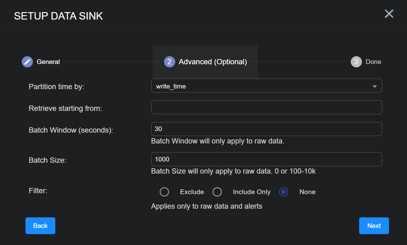 If you do not set this option, Stellar Cyber simply writes data from the time at which the sink is created.
