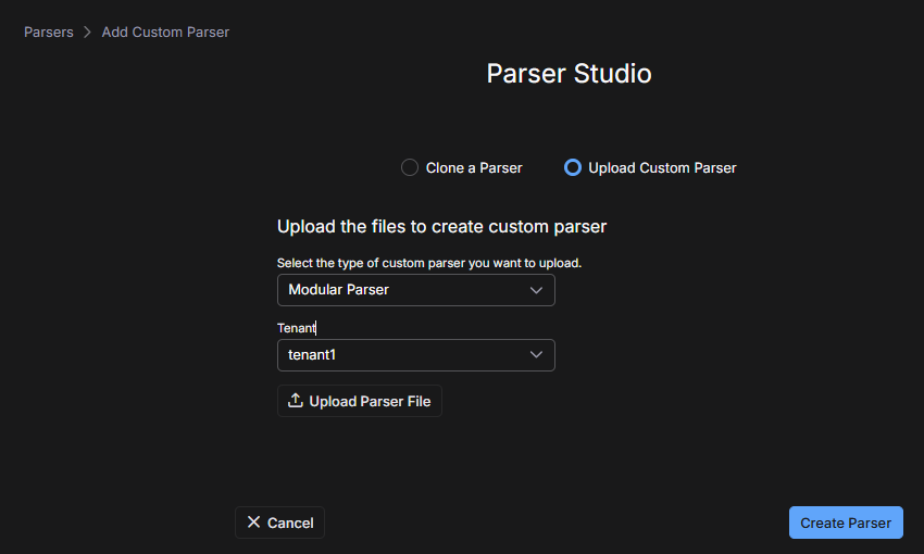 Use the following procedure only if Customer Success has already provided a parser file for your environment. To add the parser to your environment, you'll upload the file through Parser Studio.