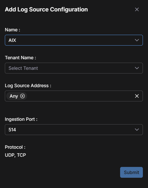 The user interface does not prevent you from having a tenant with only a single Any entry in this table. In that scenario, all log traffic for the tenant on port 514, 6514, or 443 would be sent to a single parser.