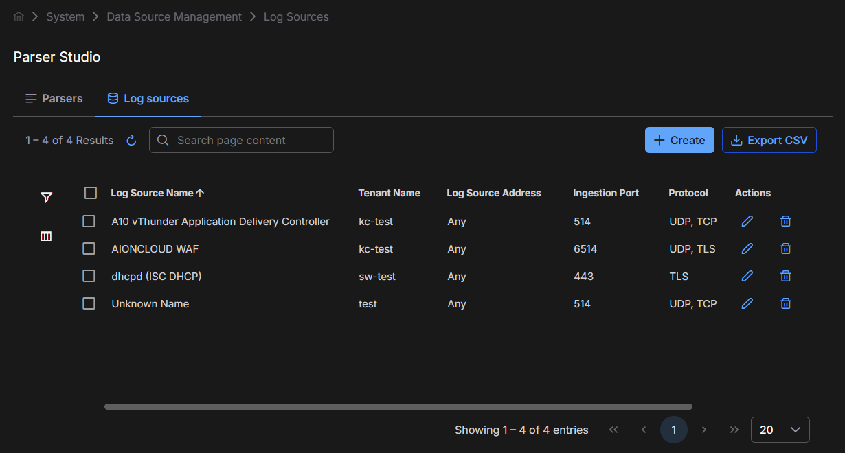 2. Navigate to System | DATA SOURCE MANAGEMENT | Parser Studio | Log Sources and select Create.