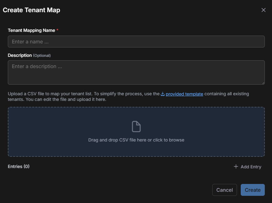Uploading a CSV file to a tenant map that already contains entries replaces all existing entries with the contents of the uploaded file. The upload does not append to existing entries. Before uploading, ensure that your CSV file contains all of the entries you want the tenant map to contain, not just the new ones you are adding.