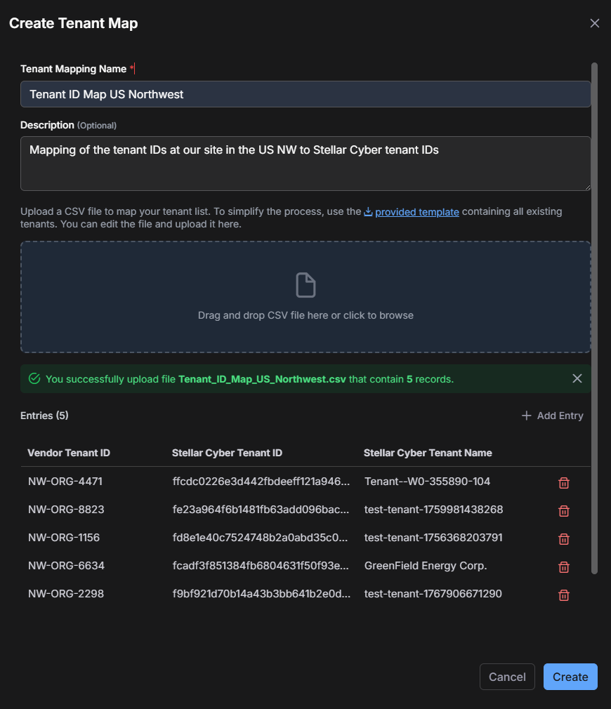 The Stellar Cyber Tenant Name column that appears in the Entries table after upload is resolved automatically from the Stellar Cyber Tenant ID. It's not a column in the CSV file and does not need to be provided.