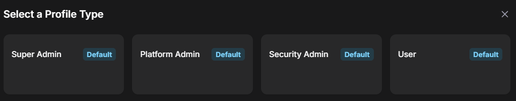 Privileges are managed through profiles, which you can create and change. Stellar Cyber provides four default privilege profile templates (which are marked Default in the View Other Profiles | Select a Profile Type panel):