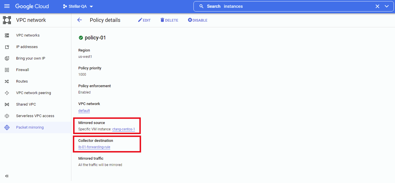The GCP documentation describes how to set up Packet Mirroring. The following procedures provide an example specific to a Stellar Cyber deployment.