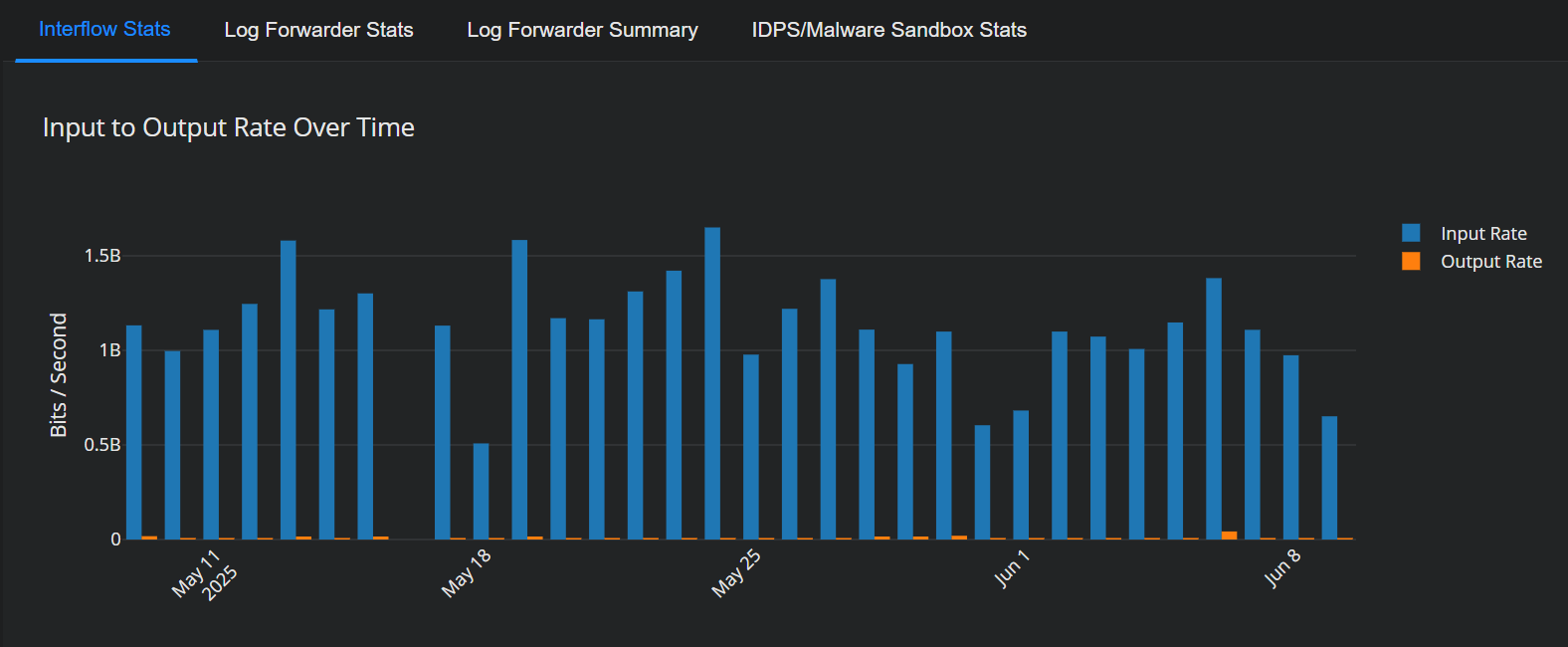 Interflow Input – The total bytes of the Interflow records created by this sensor based on ingested raw data since it was last restarted.