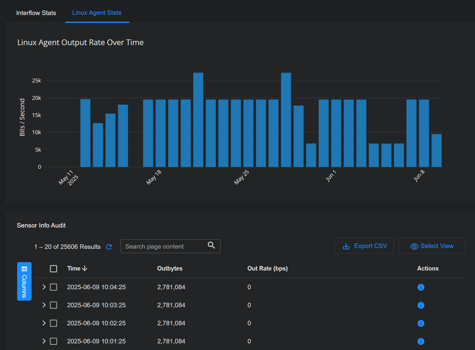 When the Linux Agent Stats tab is displayed, you can also see the Sensor Info Audit table below the graph. This table provides separate entries with metadata for the one-minute buckets of logs sent by the Linux Server Sensor.