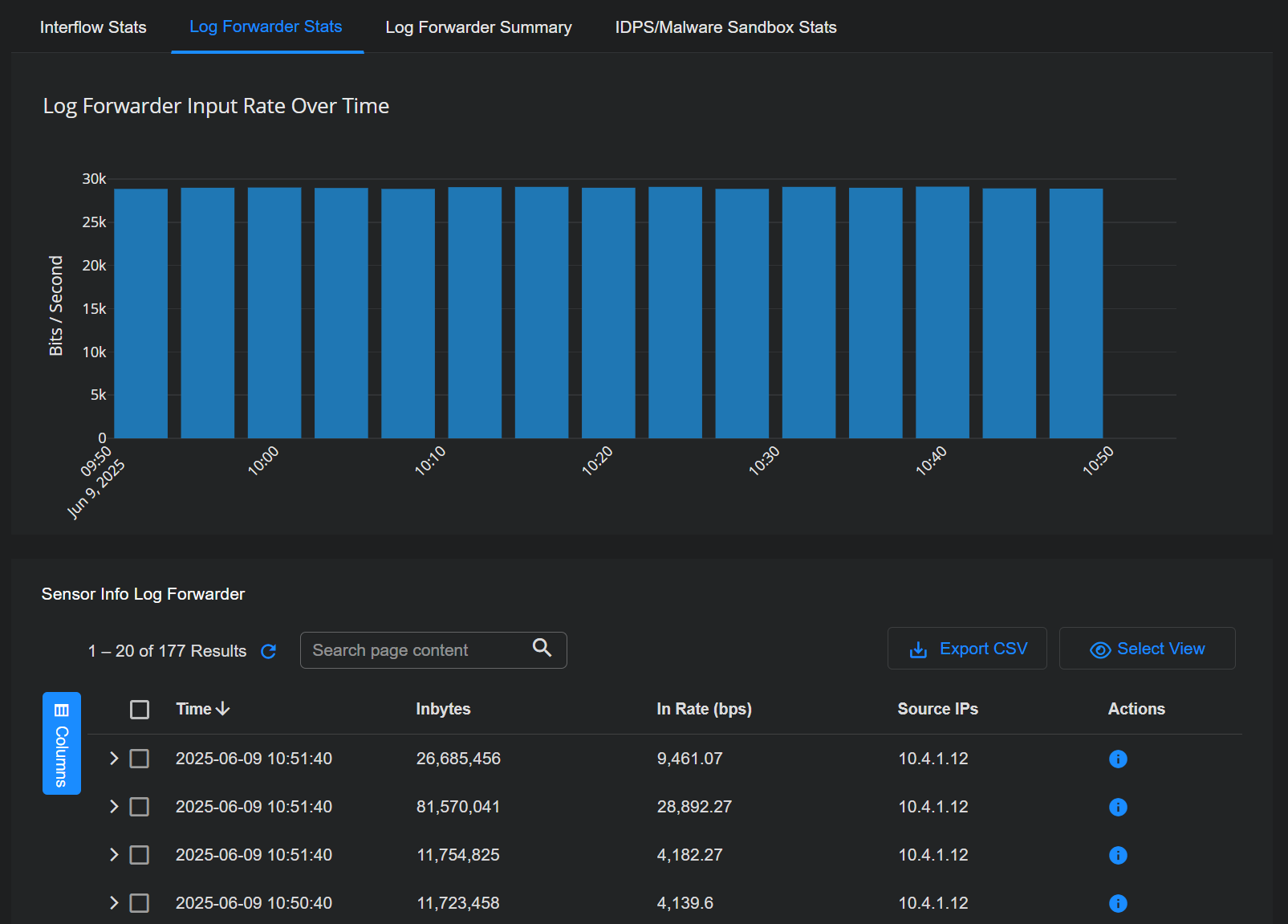 When the Log Forwarder Stats tab is displayed, you can also see the Sensor Info Log Forwarder table below the graph. This table provides separate entries with metadata for the one-minute buckets of logs received by the sensor from each log source.