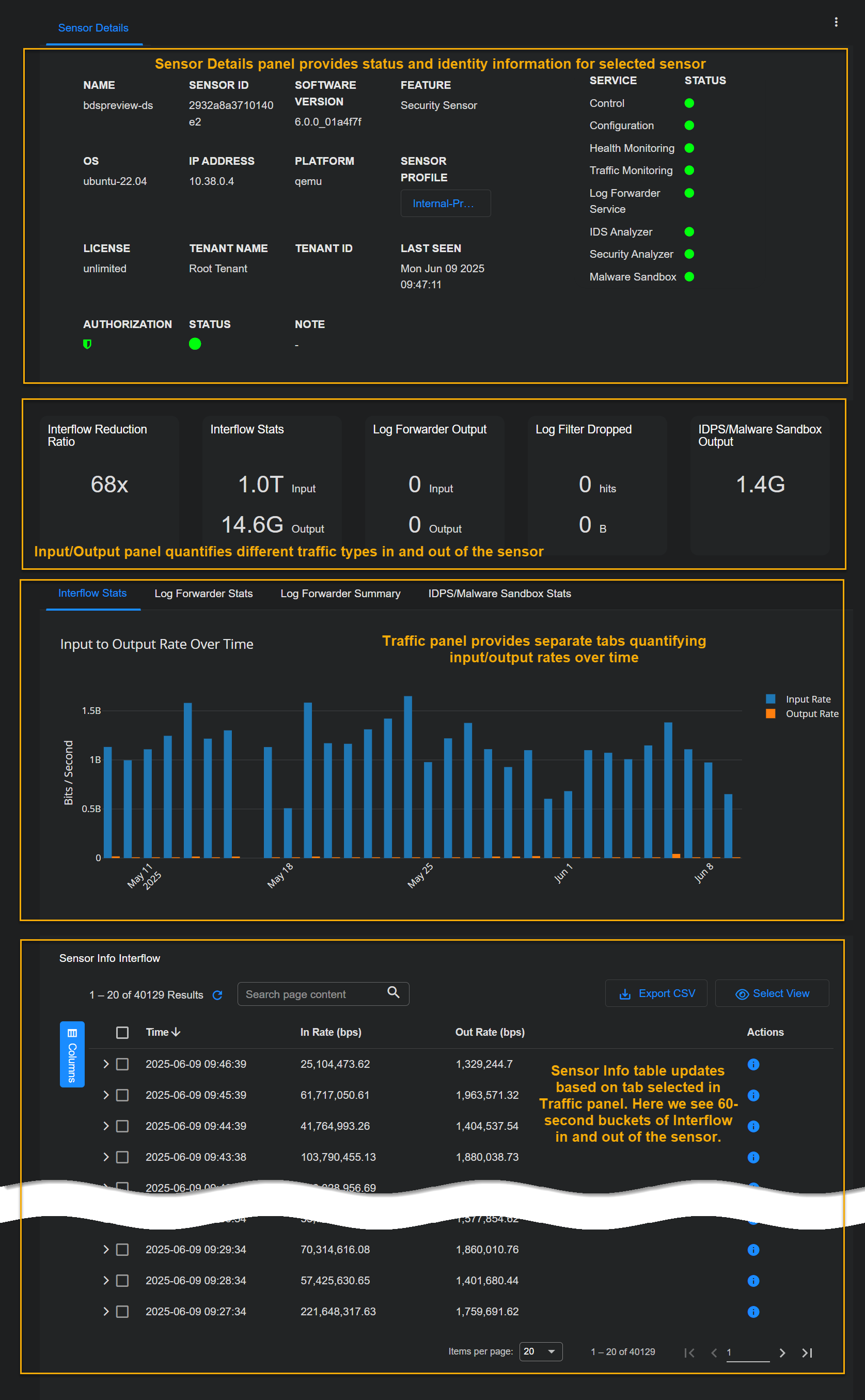 Sensor Info table is below the Traffic Graphs and displays different information based on the tab selected in the Traffic Graphs. For example, when the Interflow Stats tab is selected, the Sensor Info table provides a list of the one-minute buckets of Interflow data sent to the DP along with filterable metadata for those buckets.