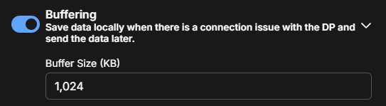 Enable this to enable buffering on the data sensors. If you enable buffering, the data sensor buffers the logs sent to Stellar Cyber. If the logs are received successfully, the sensor deletes the buffered logs. If the buffer is full, the sensor stops buffering logs. The Buffer Size parameter lets you specify the maximum size for all logs buffered: