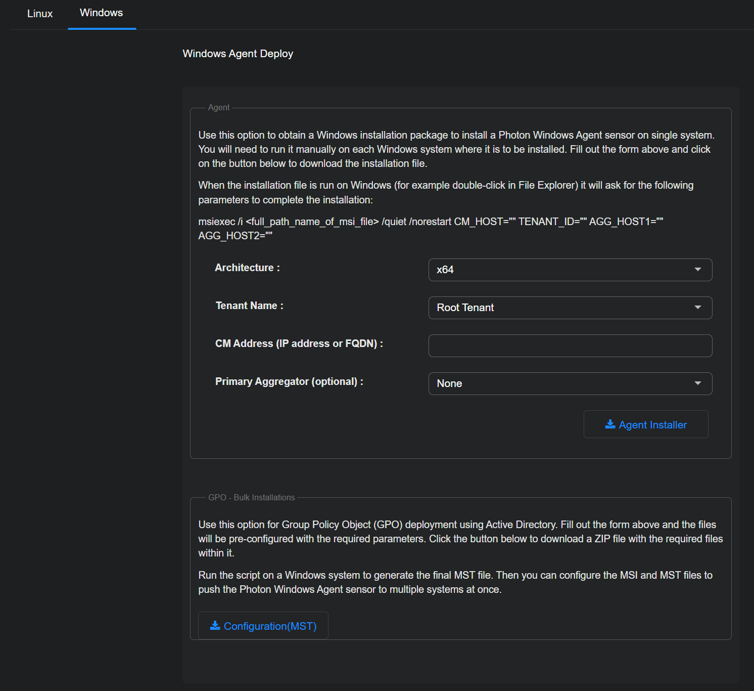 • GPO - Bulk Installations – This section downloads an MST image to the local browser environment which can be used in a Windows Active Directory installation.