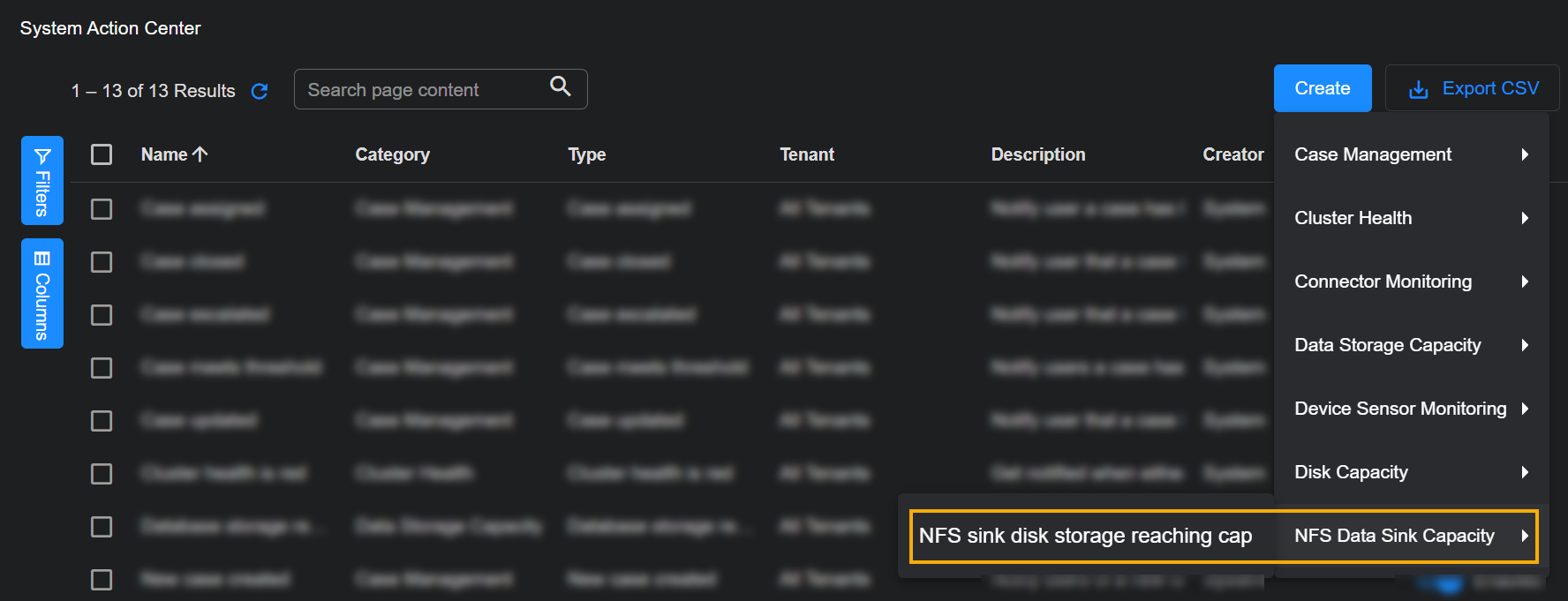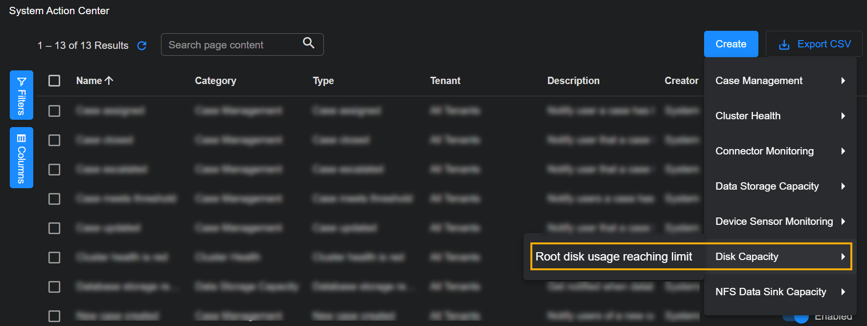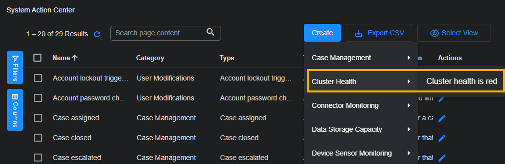 Click the Create button at the top of the System Action Center and select Scheduled Report Monitoring | Scheduled report failed from the dropdown that appears.
