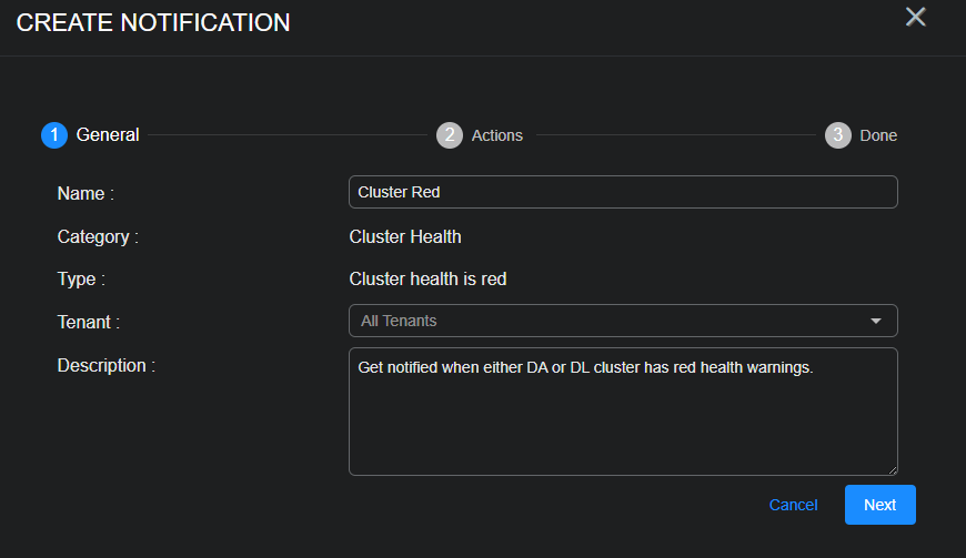 Cluster Health – Find out proactively when either the Data Analyzer (DA) or Data Lake (DL) cluster's health is in the red state.