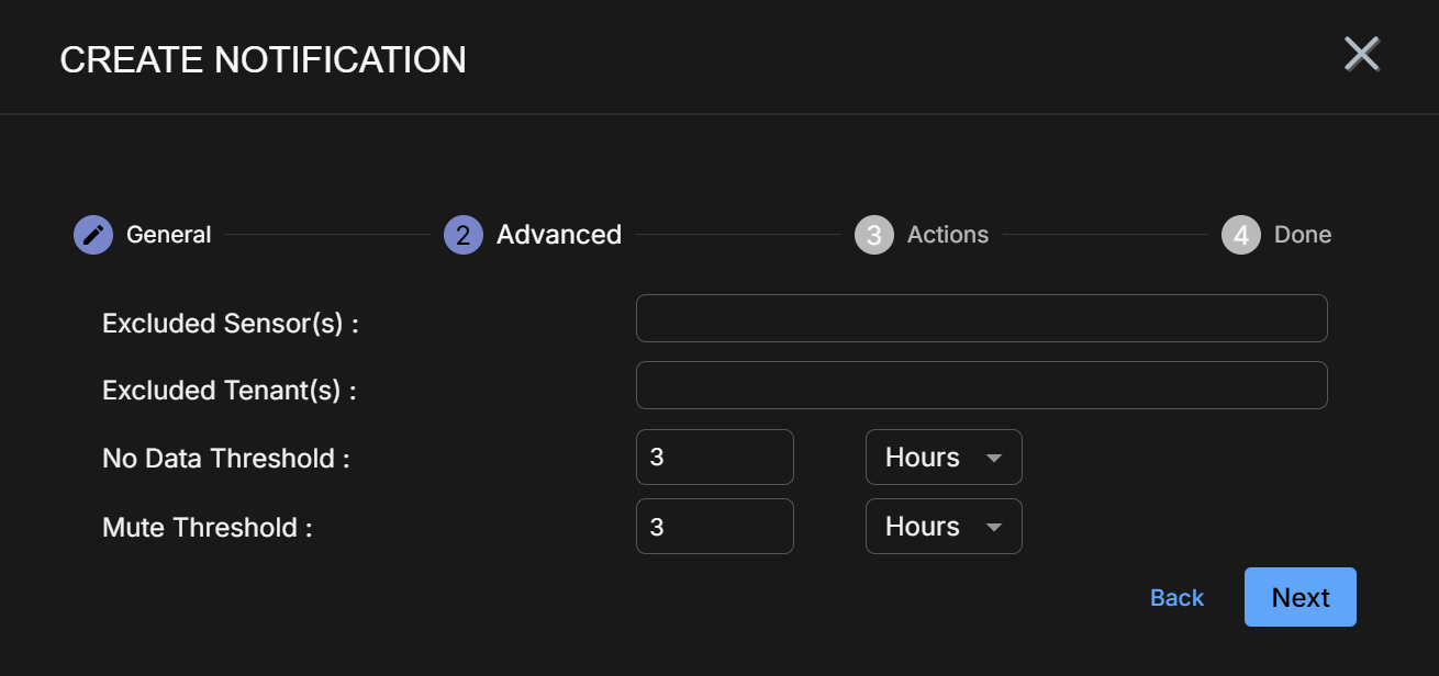 The image below shows the Advanced step for a No data from server sensor(s) rule: