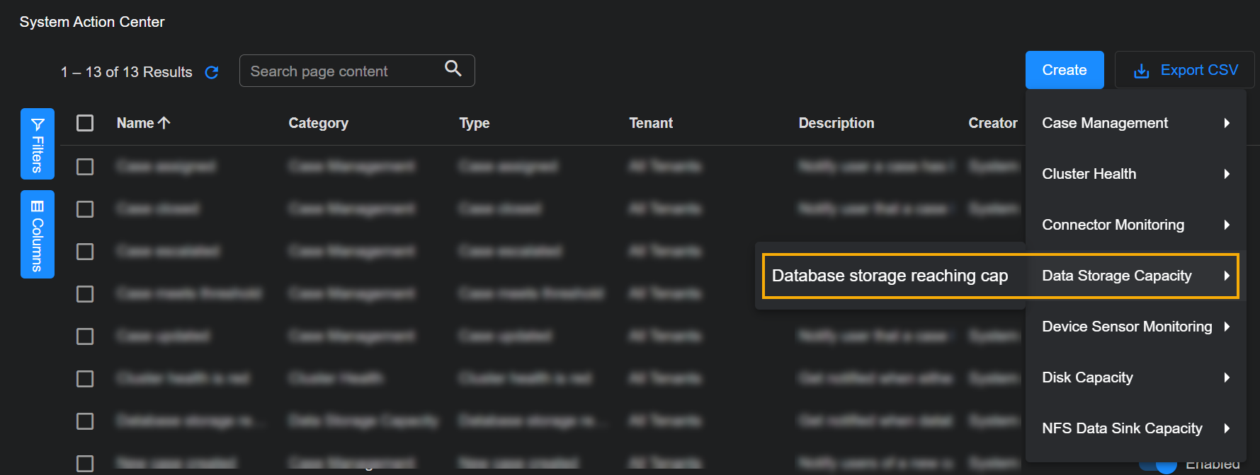 In addition, the System Action Center supports standard Stellar Cyber table functionality: