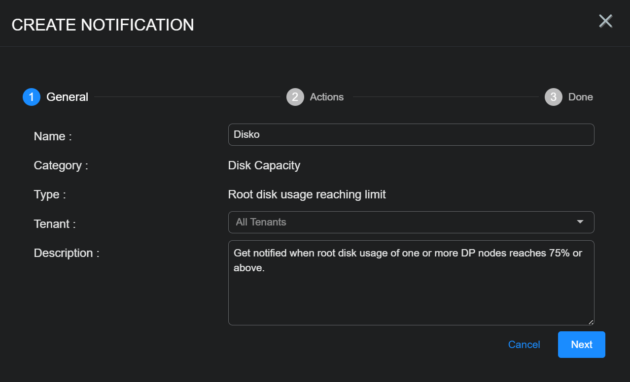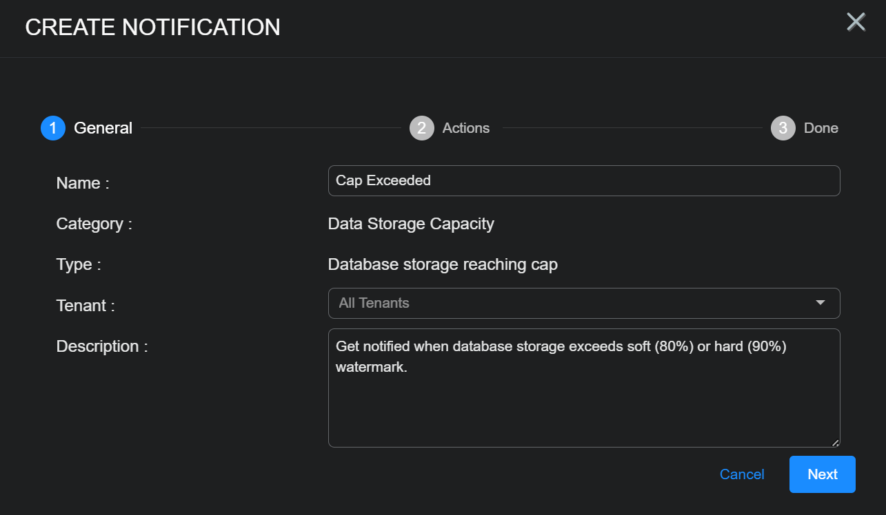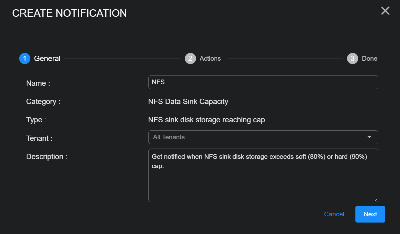 NFS Data Sink Capacity – Get notifications when NFS Data Sink storage is reaching either its soft or hard cap.