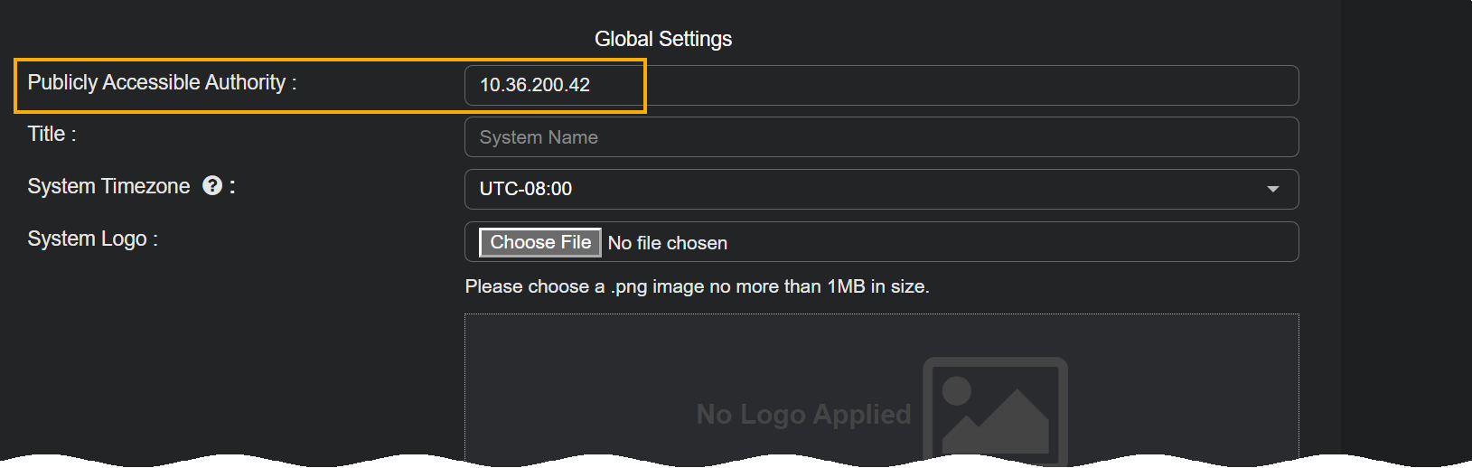 Enter the public IP address of the Stellar Cyber DP in the Publicly Accessible Authority field. This is the same IP address users enter in their browser to access the Stellar Cyber user interface. You only need to enter the IP address. For example: