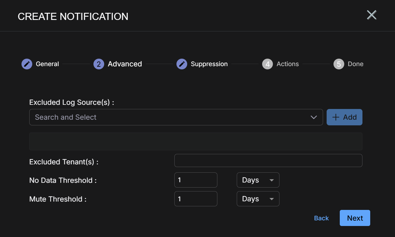 Monitors all sources globally but suppresses excluded log sources. The dropdown includes all log sources available to the tenancy selected in the previous step.