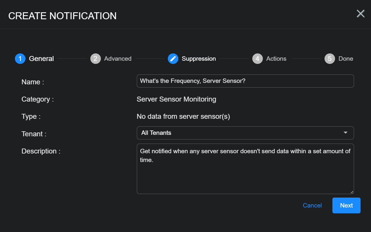 | Server Sensor Monitoring | No data from server sensor(s) | Get notified when any server sensor doesn't send data within a set amount of time. | Disabled |