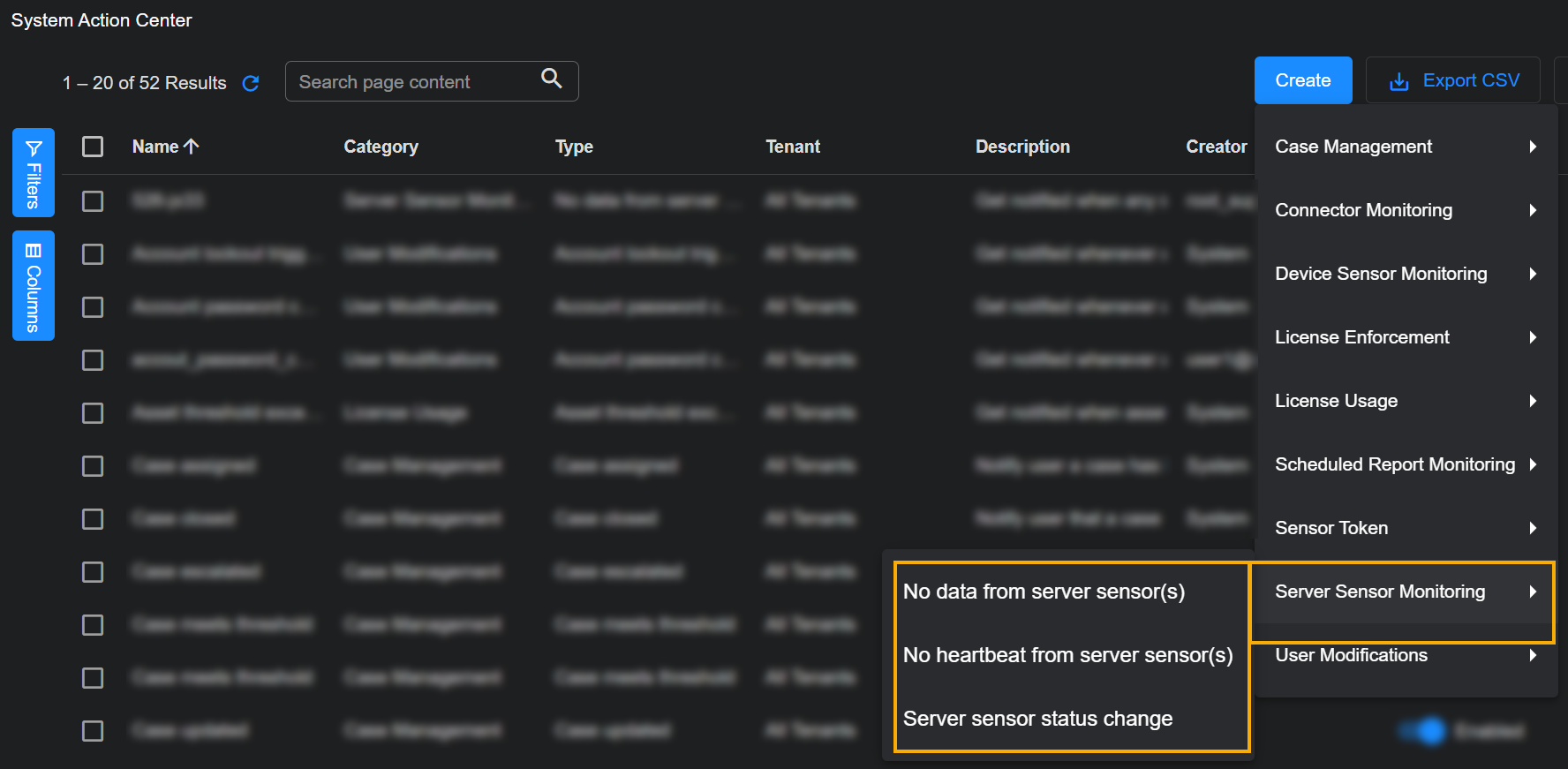Click the Create button at the top of the System Action Center and select Server Sensor Monitoring from the dropdown that appears.
