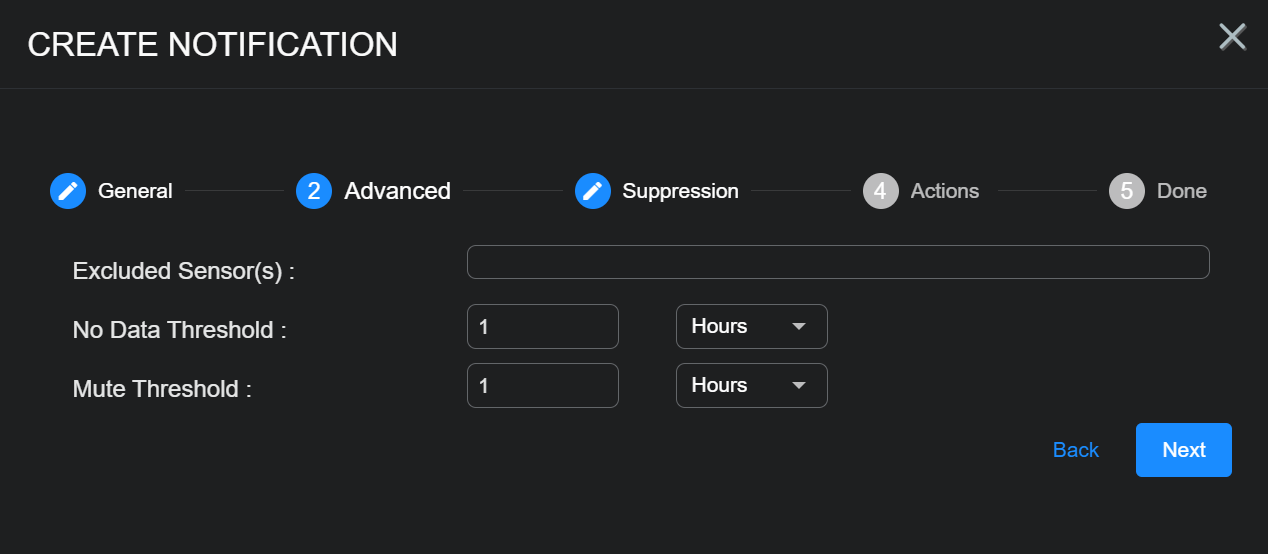 Use the Suppression step to set up a schedule of times during which notifications from the rule will not be displayed in the Notification Center or sent to configured recipients. This can be handy for suppressing notifications from sensors that you know are normally not seeing any data during specific hours.