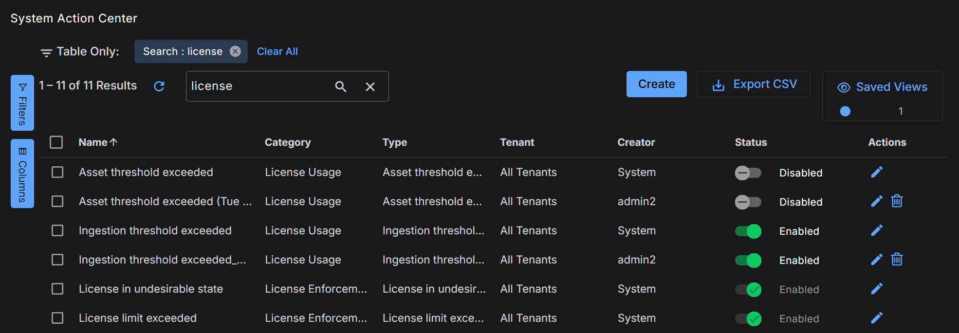 The System Action Center lists each of the defined system action rules in a standard Stellar Cyber table, as shown below.