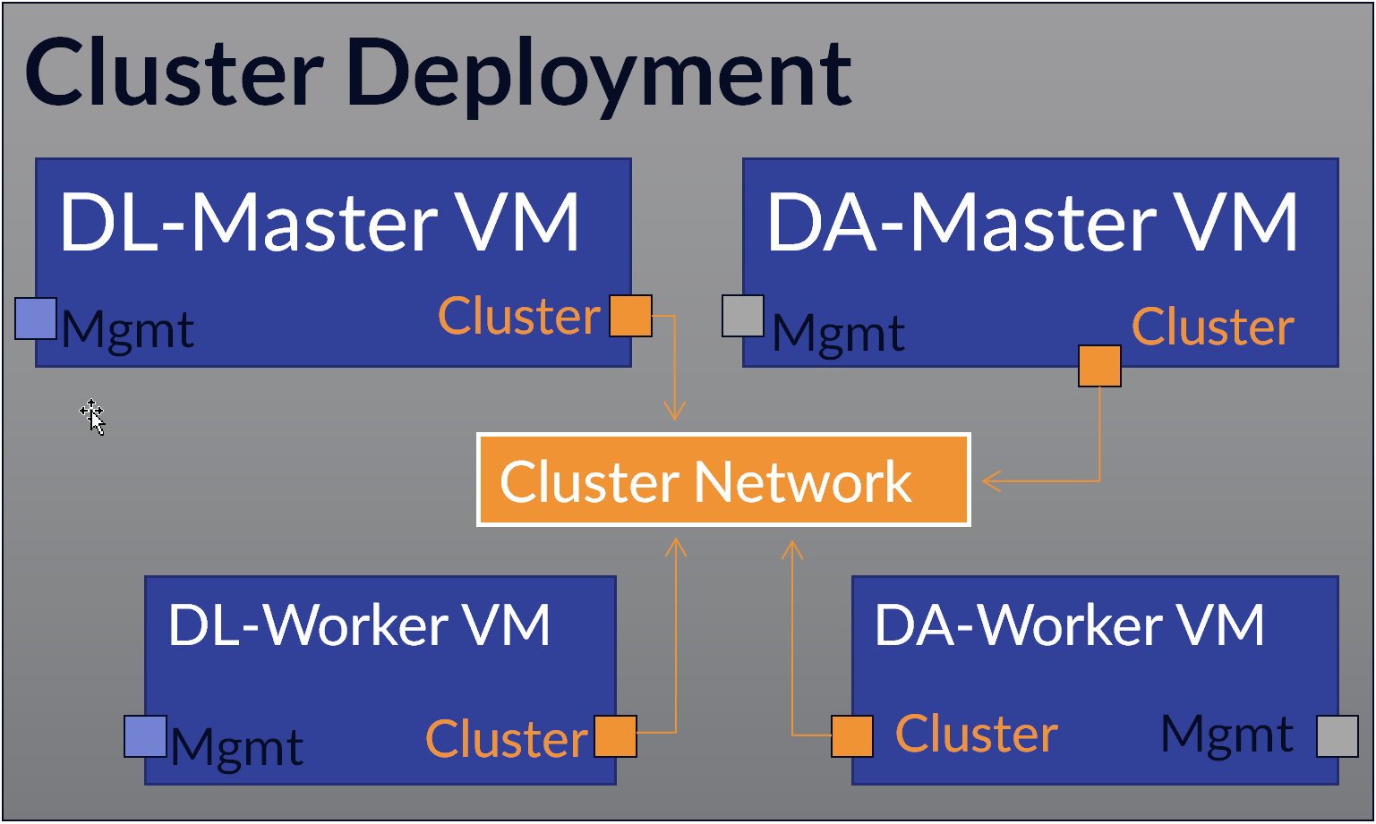 Cluster deployments allow you to scale up performance by adding additional DL-Worker and DA-Worker nodes to share the workload. Worker nodes communicate with the cluster using a dedicated cluster network.