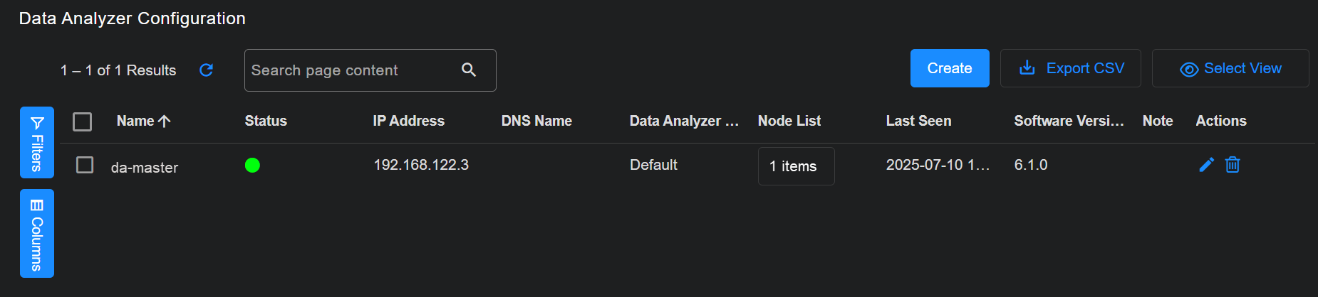 Navigate to the System | DATA MANAGEMENT | Data Analyzer page and click the Create button to create a new DA cluster.