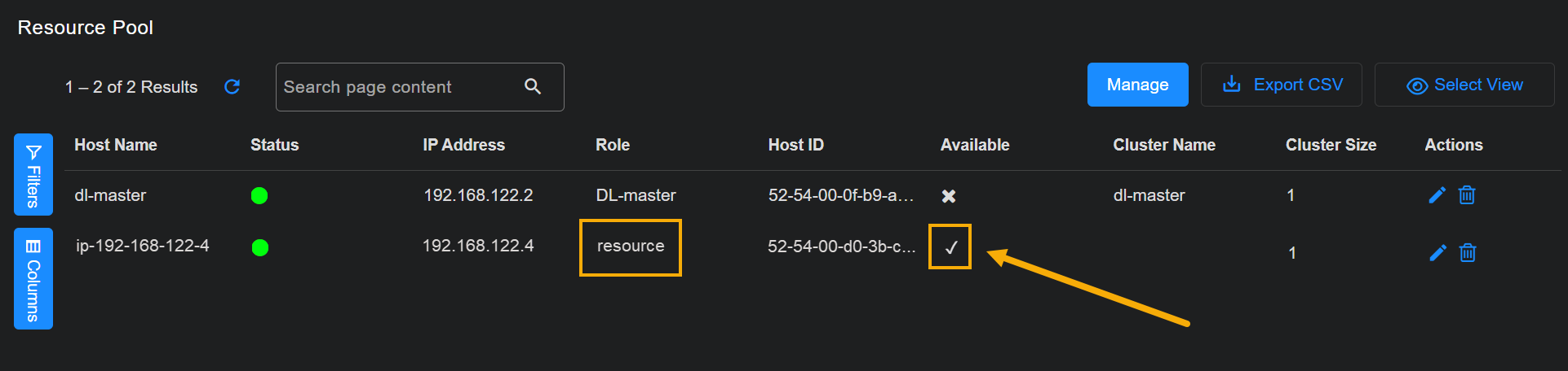 Navigate to the System | DATA MANAGEMENT | Resources page and verify that the DL-m VM is listed with a Role of DL-master and the Cluster Name you specified in the CLI. For example: