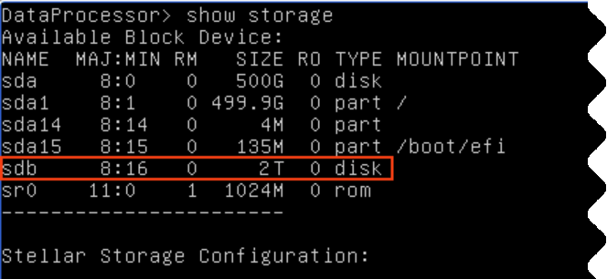 5. Use the show storage command to verify the disk is now available for use by Stellar Cyber. For example: