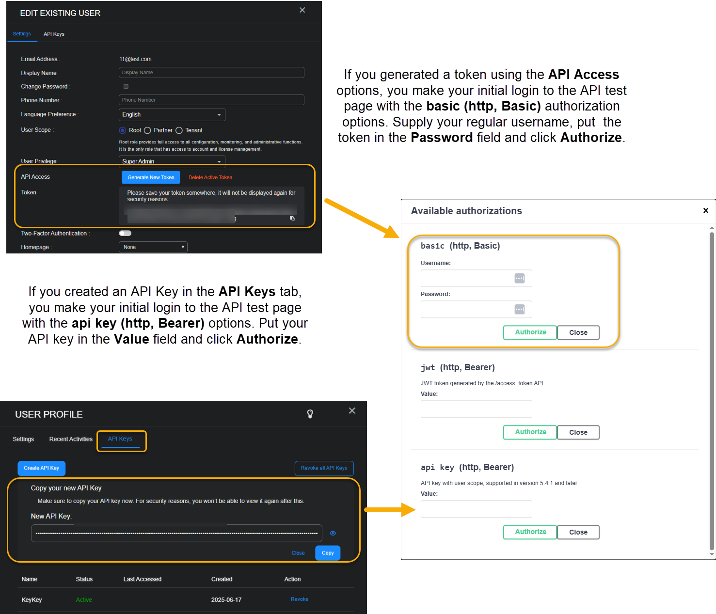 You make your initial login to the API test page differently depending on whether you are using a scoped key from the API Keys tab for your user account or you are a Super Admin with root scope using a token generated from the API Access option in the Edit User dialog box: