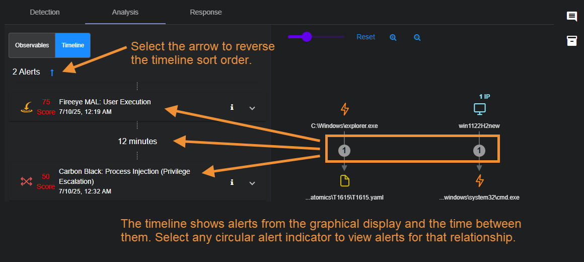 By default, the Timeline panel shows all alerts associated with the case in descending chronological order, from newest to oldest, along with an indication of the elapsed time between each event. You can reverse the sort order by selecting the arrow at the top of the Timeline, as illustrated below: