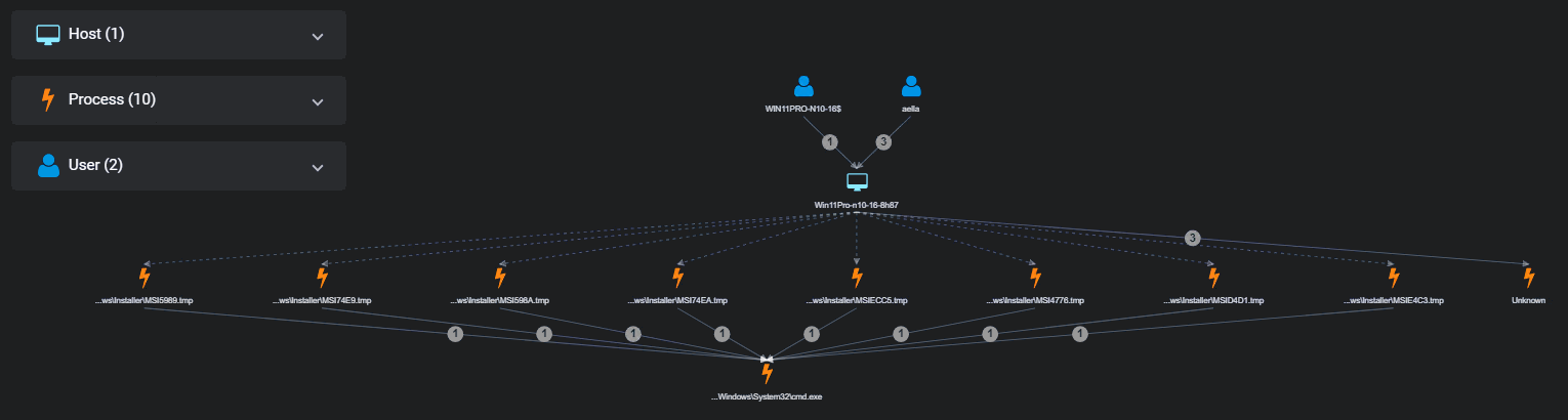Stellar Cyber optimizes the display of massive graphs with multiple levels of observables by summarizing each level of a process tree with greater than 20 of the same observable type. For example, consider the summarization shown in the figure below. Instead of showing separate associations from each *.tmp process to System32cmd.exe, the associations are summarized to improve display performance: