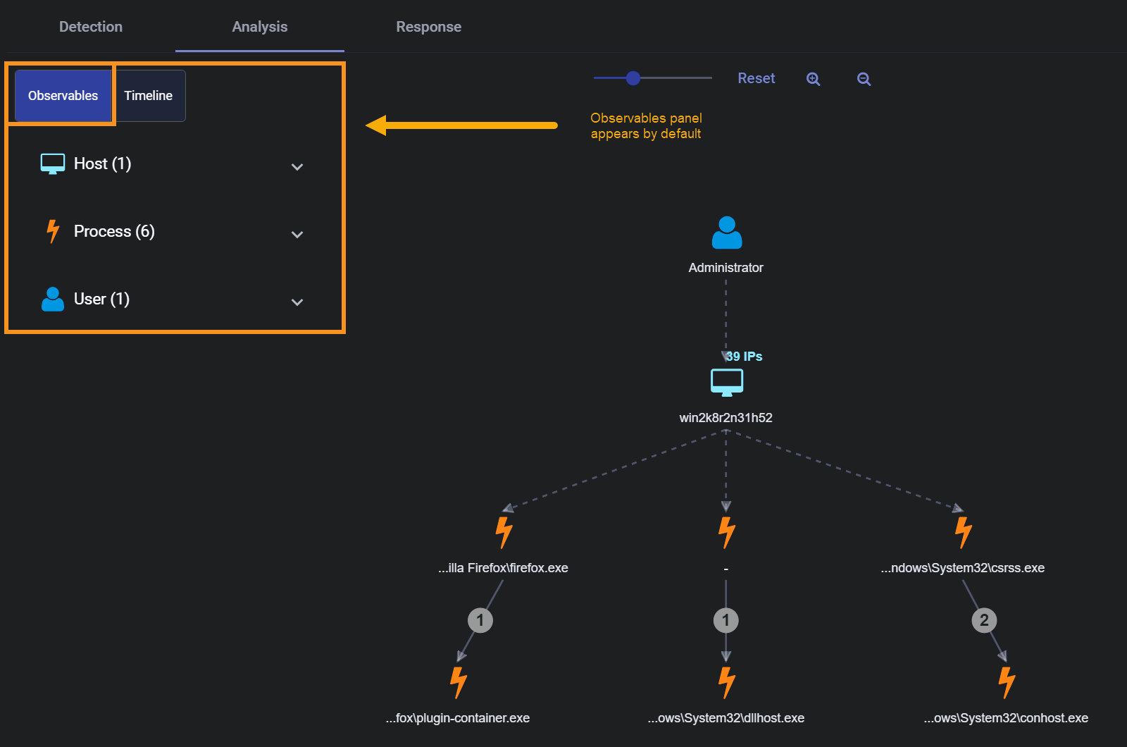 The Analysis workspace represents events taking place between different entities with solid lines, while dotted lines represent parent/child relationships. For example, the dotted lines in the figure below indicate a parent/child relationship between a host and a process: