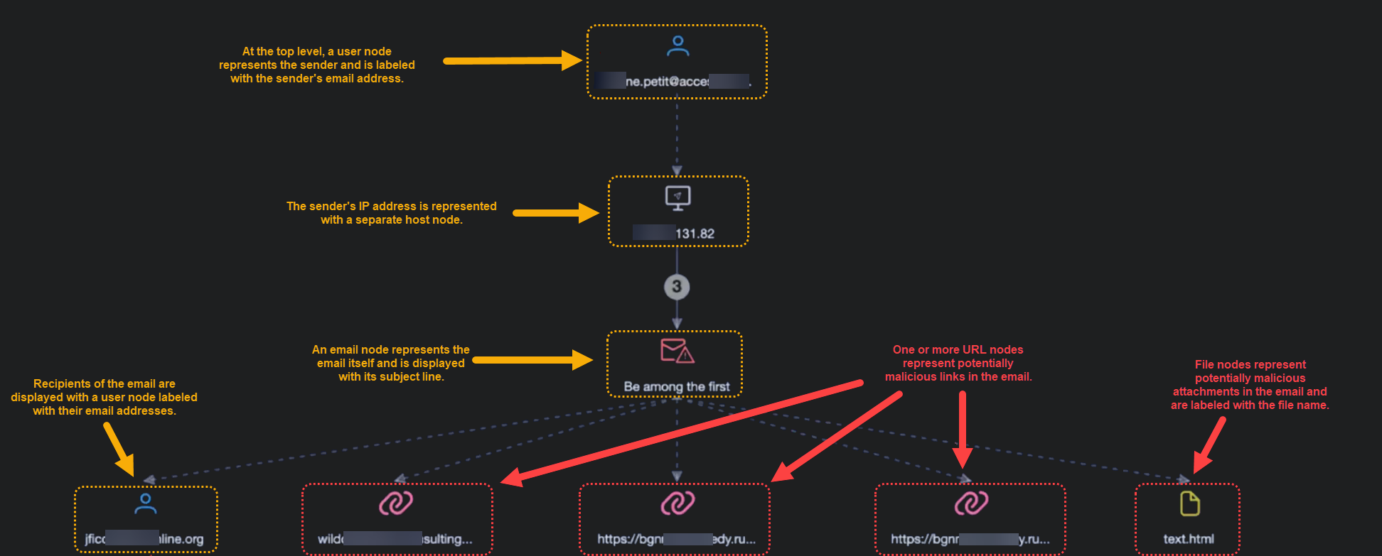 Any potential malicious attachments or links are shown with their own nodes connected to the email node. They are labeled with either the filename of the attachment or the URL of the link, depending on what is being displayed.
