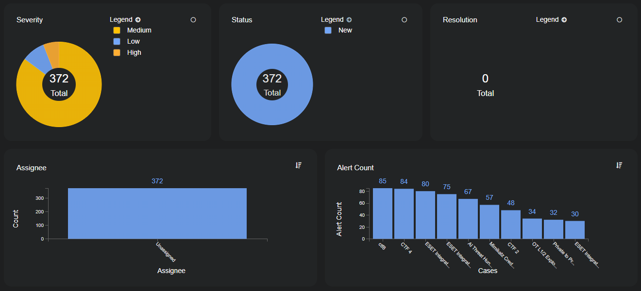 Circular charts (Severity, Status, and Resolution) can be viewed in either donut or pie mode using the controls at the top right of the individual charts and are color-coded using the supplied legend. Bar charts (Assignee and Alert Count) can be viewed in either horizontal or vertical mode using the controls at the top right of the individual charts.