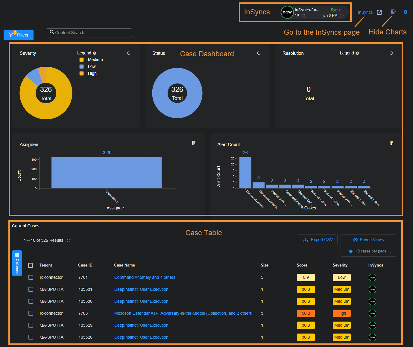 If there are any InSyncs configured, they appear as separate indicators at the top of the Cases page with high level status indicators for the health of the sync. In addition, there is also an InSyncs button that you can select to navigate to the InSyncs page where the integrations are configured. For example: