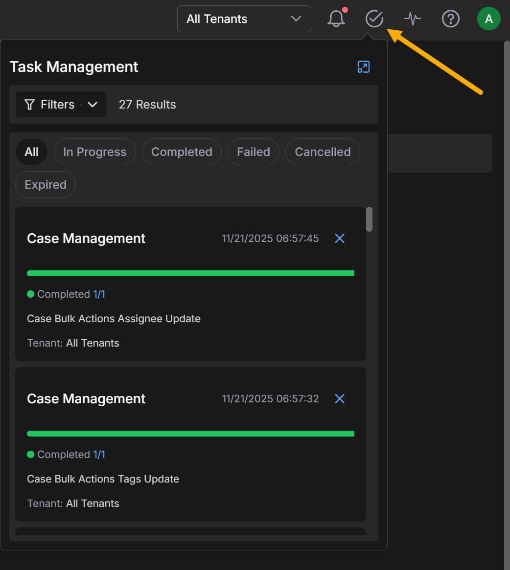 You can display the Task List using its icon at the top of the display, as illustrated below. The Task List keeps track of the progress, success, or failure of any bulk actions performed from the Current Cases table, as well as any other ongoing Stellar Cyber activities. Depending on the number of cases affected by a bulk action, it make take a few seconds for the action to complete. The Task List is useful in these situations, letting you see the progress of the action. Here's how you display the Task List, complete with some successful bulk actions: