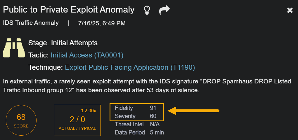 - Fidelity – The confidence in the analysis. Higher fidelity indicates greater confidence that a malicious event was correctly identified and increases the alert score. Lower fidelity, especially when combined with low Threat Intel scores, reduces the alert score.