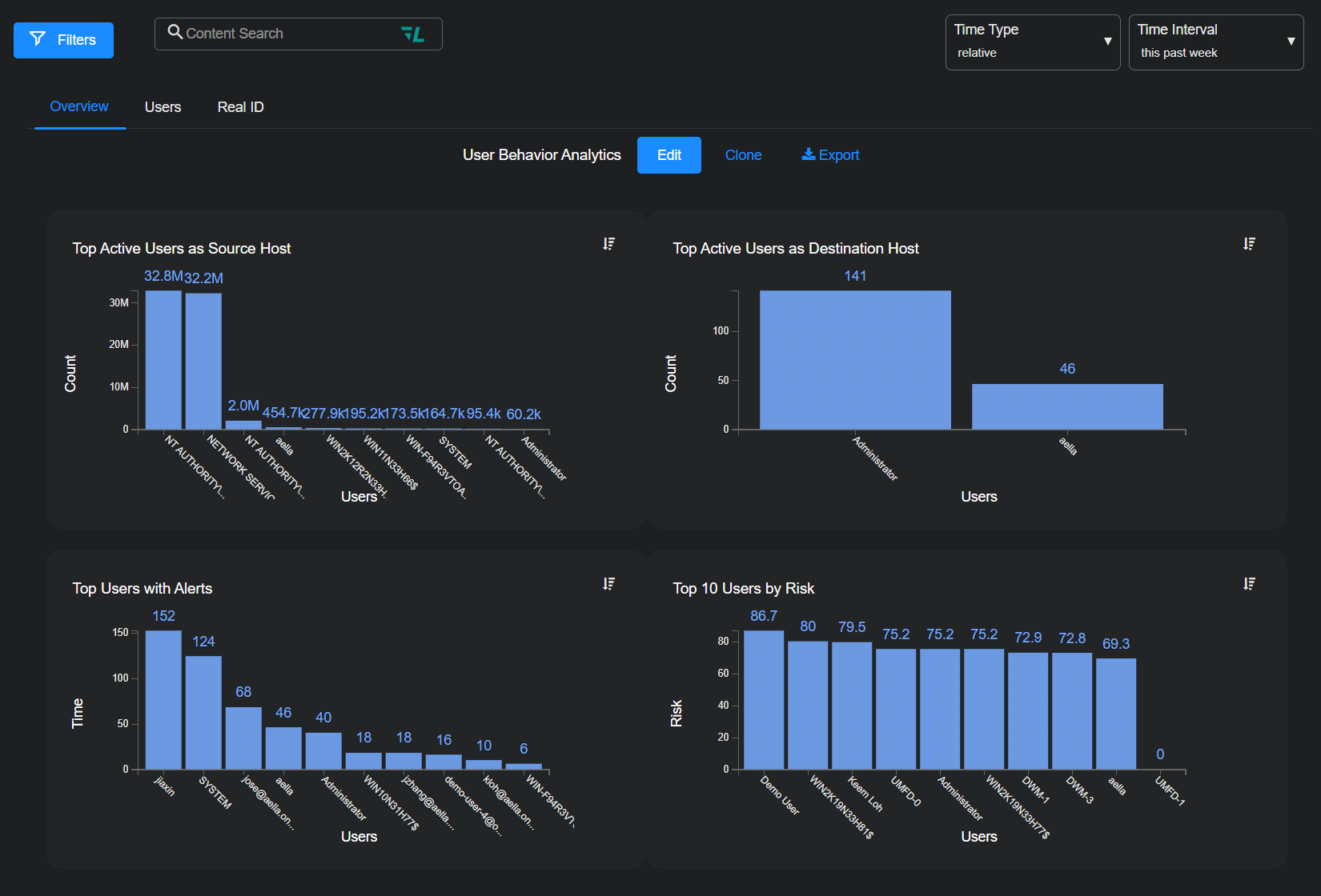 The overview dashboard provides a visual perspective of top users for aspects that may be of interest for further analysis.