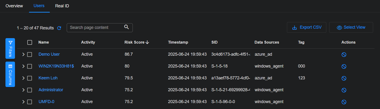The Real ID dashboard shows a table of users with all of their various identities. The identities are imported from Active Directory and correlated with a single SID. That SID is used to link all user identities.