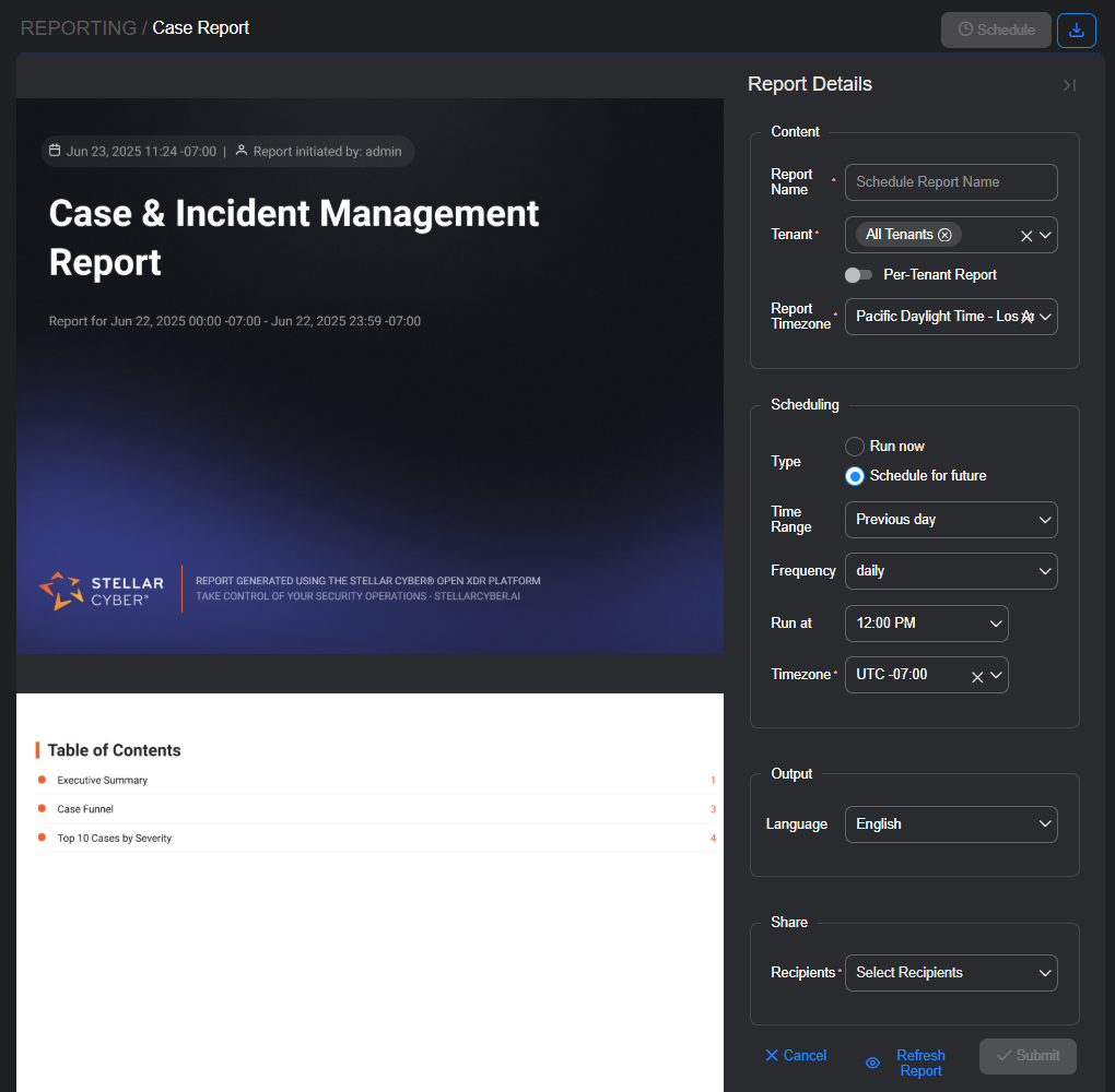 Choose the language in which you want the report written. By default, Stellar Cyber uses the language setting in your user profile.