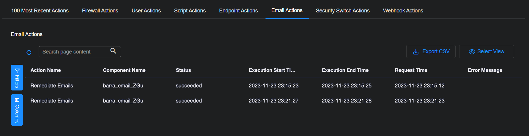 The Automation | Action History | Email Actions tab displays the actions taken manually from the Event Display in response to a detected threat in email traffic. See Creating Remediation Email.