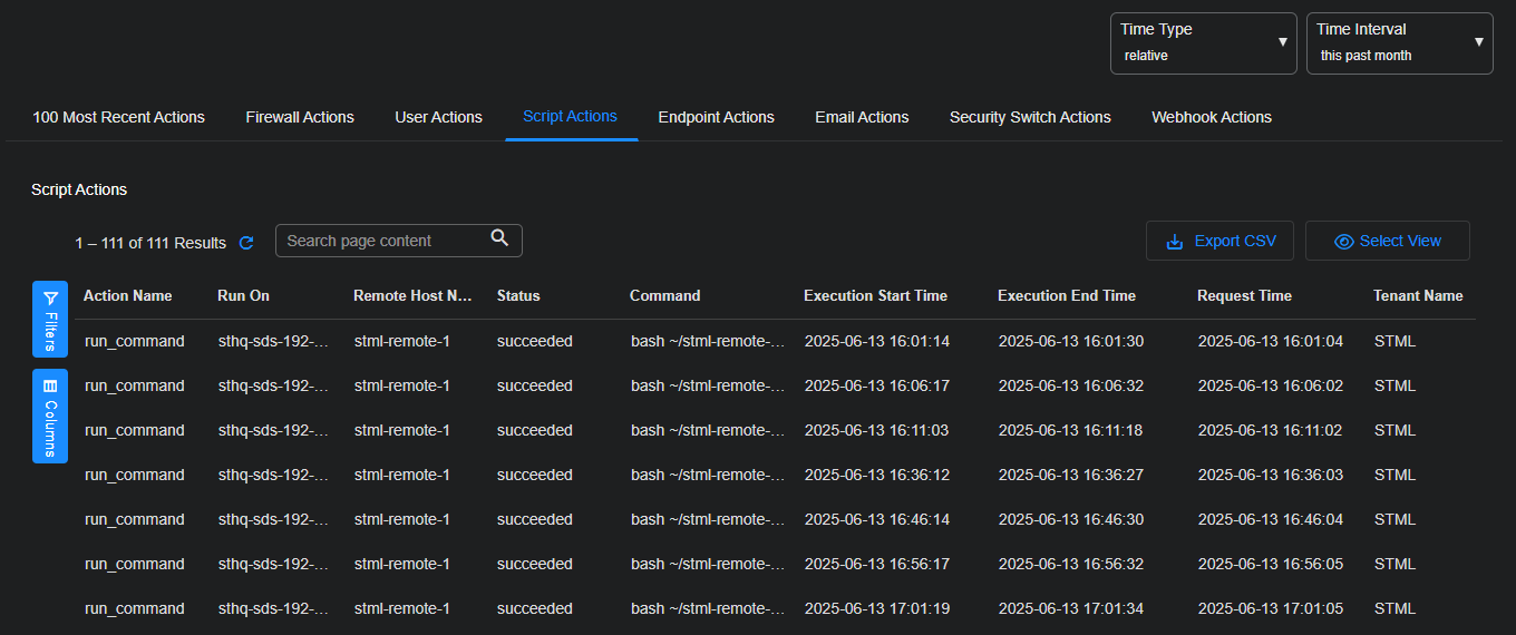 The Automation | Action History | Script Actions tab displays the script actions specified manually from the Event Display or automatically by Automated Threat Hunting. Use the columns to reveal more information about the script itself. Scripts can be created in advance by users with administrative access. See Creating Saved Scripts.