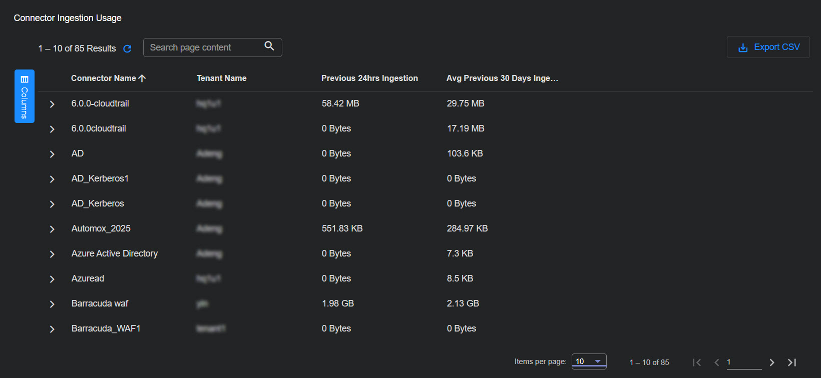 Each of the tables in the Ingestion Dashboard supports standard table actions, including search, sort, CSV export, column change, and table refresh.