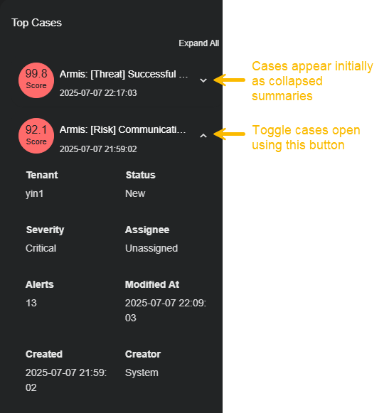 Cases appear initially in the Top Cases panel as collapsed summary entries, but can be cascaded open using the ˅ button at their right, as shown below. You can also expand all of the entries in the list using the Expand all button at the top of the panel.