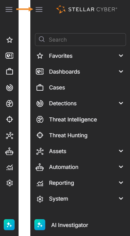 icon to expand the icons into text menus to navigate to any function in Stellar Cyber.