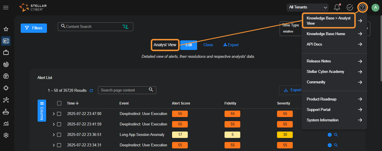 The brief Top menu is always displayed for any browser scaled wider than a mobile screen. It provides you access to the Quick Start topic, the Stellar Cyber Customer Success Portal (Support), Alert Coverage, the Search field, and the Stellar Cyber Chat feature at all times. The Quick Start is helpful for both analysts and administrators to revisit as you learn the product.