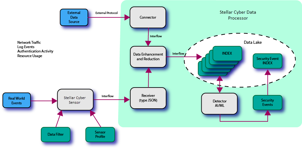 - Data Lake and Indices – The Data Lake is the repository of the information that Stellar Cyber stores. The data is organized into indices, which are categories that Stellar Cyber uses to group data. The indices help make searching much more efficient and effective. An index that stores information directly from the sensors or collectors is referred to as a "raw" index. The security index contains enhanced data based on data from one or more of the raw indices.