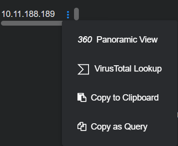 In certain parts of Stellar Cyber, IP addresses and hostname fields may not have a more button. Click the field value itself to display the field actions menu.
