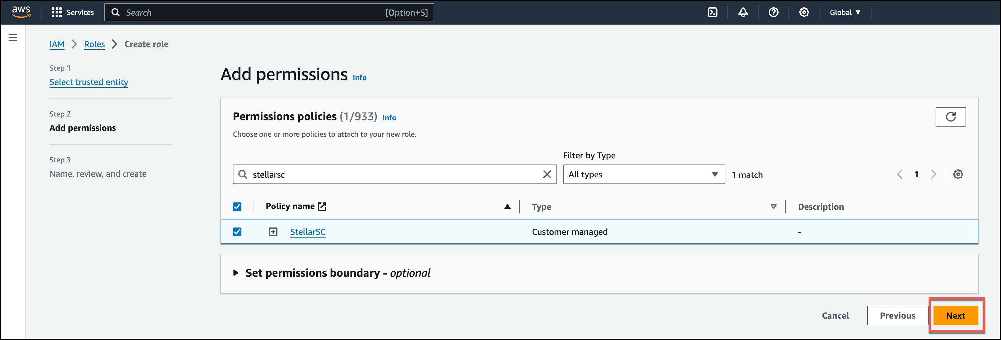 On the Set permissions page, choose Attach policies directly. Then search for the policy you created above.